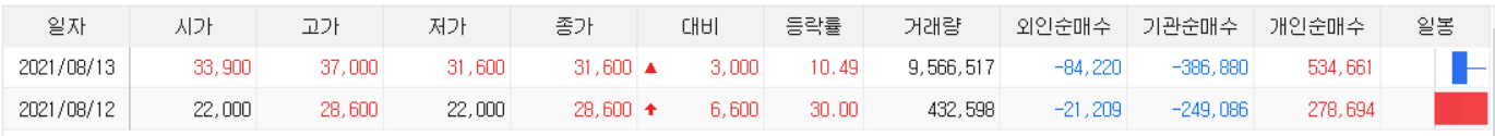 12일 상장일부터 2일차인 13일까지 외인과 기관이 순매도한 것을 개인이 거의 순매수하였네요. 16일 대체휴일 이후에 17일에는 어떻게 될지 궁금하기도 합니다.