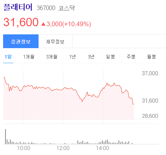 공모가 11000원의 플래티어 첫날 따상을 간 후 둘째날 상에서 하락하는 모습을 보였는데요. 계속 하락하다 20%정도에서 횡보하길래 더 상승할 여력이 있다고 판단하였으나 결국 그렇지 못하고 10.49% 오른 31600원에 장을 마감하였습니다.