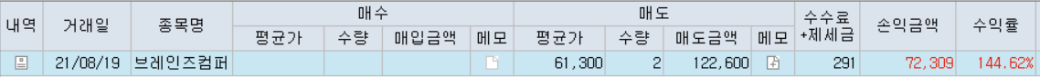 2주를 122,600원에 매도하였고 144.62%의 엄청난 수익?을 거두었습니다. 주식이 이런수익을 가져다주면 얼마나 좋을까요?ㅋ 손익금액은 72,309원이라 치킨 3번정도 먹을 수 있을 것 같습니다. 공모주 청약자님들도 모두 좋은 수익으로 마무리 지으시길 바래봅니다.