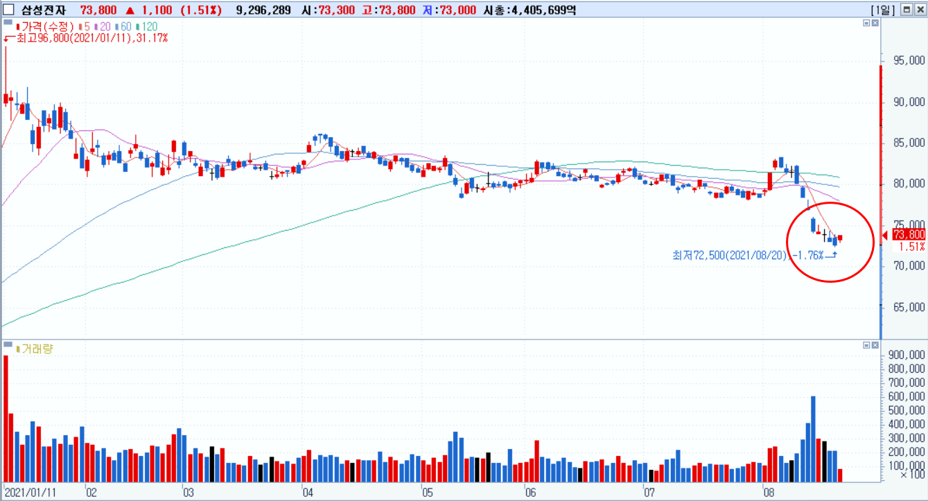 삼성전자 지난 1월부터 일봉챠트입니다. 최고가 96800원을 기점으로 쭈욱 하락세를 타는 모습이었다가 8월에 급락한 모습이며 오늘부터 반등이 이어졌으면 좋겠네요.