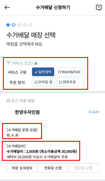이제 매장을 선택하면 되는데 서비스 구분에 일반세탁인지 아니면 Wash&Fold 인지 선택하시고 주문방식을 모바일 앱 또는 전화주문으로 선택하시면 됩니다. 저같은경우는 근처 0.1 km 이내에 있는데 앱으로 신청은 안되고 전화로 신청만 가능하네요 ㅠ