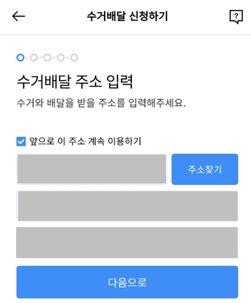 그리고 수거배달 주소를 입력하면되는데요. 주소찾기를 통해 주소를 입력하고 앞으로도 계속 이 주소를 사용하고 싶으면 체크박스를 체크하고 다음으로 가시면 됩니다.