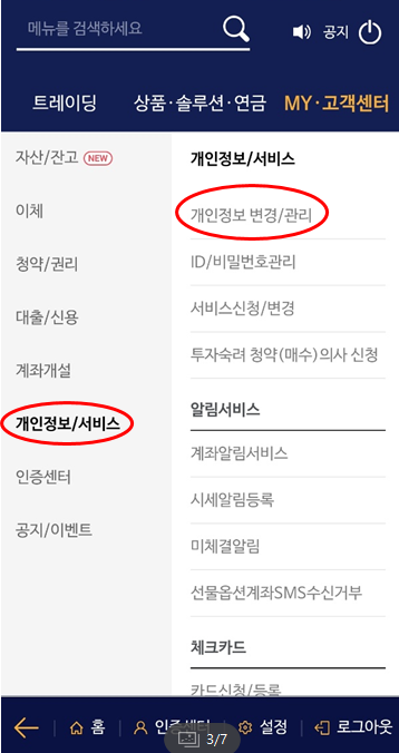 개인정보/서비스 - 개인정보 변경/관리를 클릭하면 하단의 내용이 나옵니다.