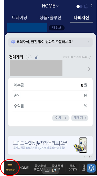 공동인증서를 입력하고 모바일로그인 후에 좌측하단의 전체메뉴를 누릅니다. 부끄러워서 저의 금액과 손익, 수익률은 가렸습니다. -_-