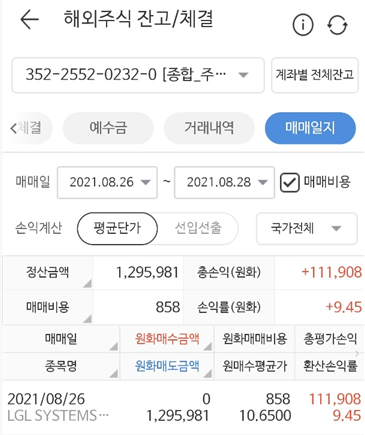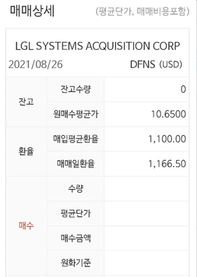 매매손익은 34.57달러로 원화로 환산하면 38,027원인데 환차손익이 73,881원이어서 111,908원 수익이 되었습니다. 단순히 주가 손익은 3.21%인데 환차손이 큰 역할을 한 것 같습니다. 이래서 환율이 낮을 때 달러를 매수하면서 모아가는게 좋은 투자중에 하나인 것 같습니다. 종목명 LGL SYSTEMS ACQUISITION CORP 이며 티커 DFNS의 매도 수익이었으며 미국 스팩을 투자하시는 분들은 더 큰 수익 얻으시길 응원하겠습니다.