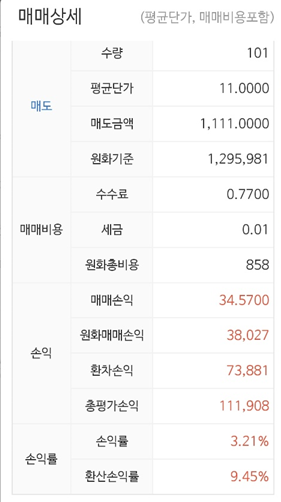 DFNS 스팩을 매도 후 환산손익률을보니 9.45달러인데 총평가손익은 111,908원이었습니다. 이해가 잘 안되서 매매일지에서 종목을 눌러 자세히 확인해 보았습니다.