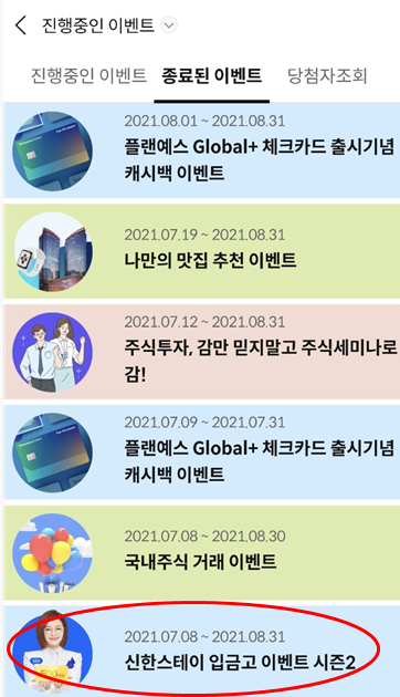 저는 8월 이벤트를 진행했기 때문에 종료된 이벤트로 검색하면 8/31까지인 신한스테이 입금고 이벤트 시즌2를 진행했습니다. 이 글을 보고 진행하시려는 분들은 아마 시즌3가 9월에 진행될 것 같습니다.