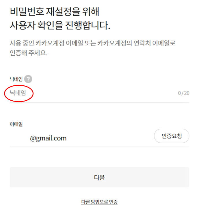 카카오계정 비밀번호 재설정을 위해 방금 찾은 이메일 주소를 입력합니다.