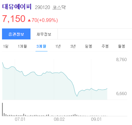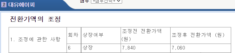기존 7,840원에서 7,060원으로 전환가액이 조정되었으며 주식수도 조정전 380만주 정도에서 420만주로 늘어났습니다. 공시에는 매 3개월마다 전환가액을 조정할 수 있다고 밝혔으며 조정가액 적용일은 9월 11일입니다. 이제 조정도 했으니 대유에이피의 주가가 오르길 바라며 호재하나 터져줬으면 좋겠습니다.