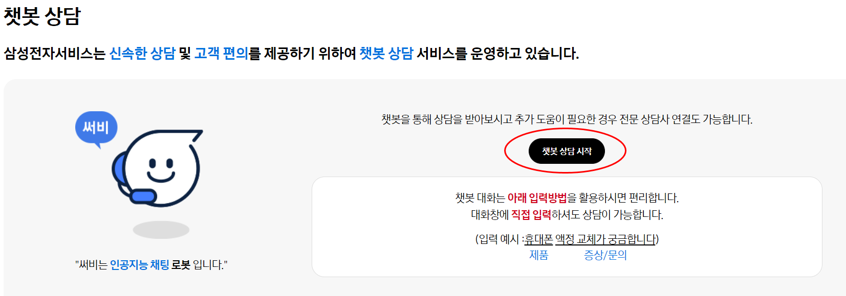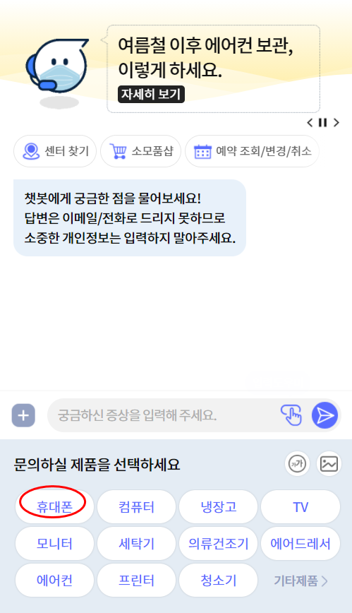 카카오톡으로 진행하셔도 되고 pc를 이용해서 위와같이 "챗봇 상담 시작"을 클릭합니다. 상담받다가 잘 안되면 상담사도 연결해준다고하니 정말 삼성이 최고네요.