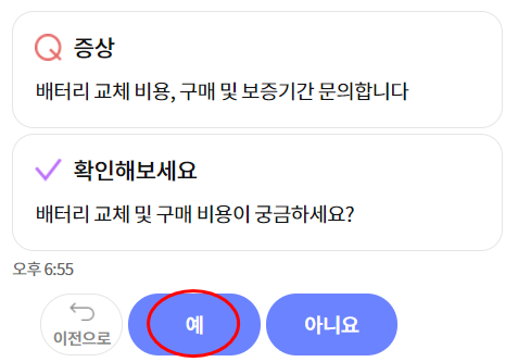 배터리 교체 및 구매 비용이 궁금하냐고 묻는데 "예"를 선택하세요.