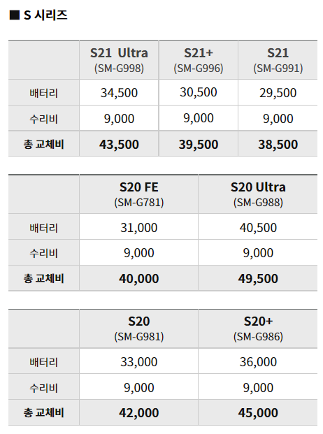 21년 9월 예상 비용인데 최신화 되어있고 매달 업데이트를 잘해주는 삼성센터네요. 특이한 점은 모델에 따라 배터리 교체 비용이 1000원에서 4000원 추가될 수 있다고 합니다. 또한, 색상??에 따라서 비용이 달라질 수 있다고 하는데 배터리가 색상에 따라 달라질 이유가 있나싶네요. ㅋ