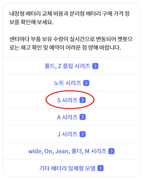 S 시리즈를 선택하시면 되고 s10e는 내장형 배터리가 사용되고 있습니다. 이후에 센터마다 부품 보유 수량이 나온다고 하니 참고하시면 될 것 같습니다.