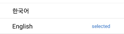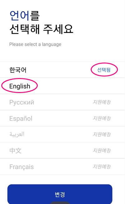 언어를 선택해주는 화면인데 현재는 한국어에 선택되어있고 영어, English를 눌러주세요.