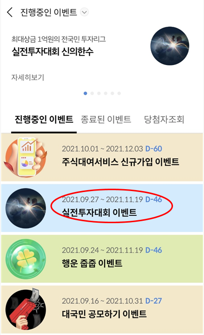 두번째로 보이는 진행중인 이벤트, 실전투자대회를 클릭해주세요.