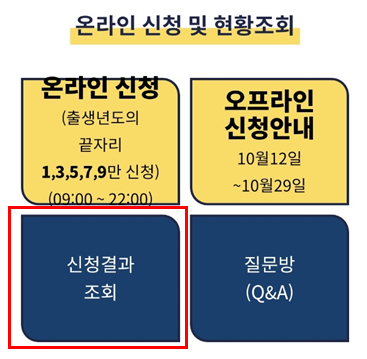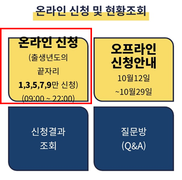가운데 온라인 신청 및 현황조회에서 온라인 신청을 눌러주세요. 오전 9시부터 오후 10시까지 신청 가능하며 출생년도 끝자리의 1,3,5,7,9만 신청가능한 메뉴입니다.