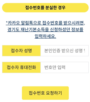 혹시 접수는 했는데 접수번호를 분실하거나 잊어버리셨다면 접수자 성명과 휴대전화를 입력해서 접수번호를 요청하시면 됩니다.
