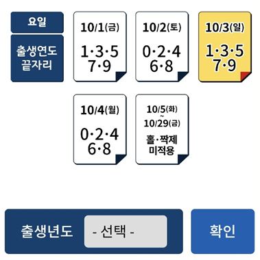 홀짝제 시행으로 오늘 10월 3일은 1,3,5,7,9 이며 출생년도를 선택하고 확인을 클릭합니다.