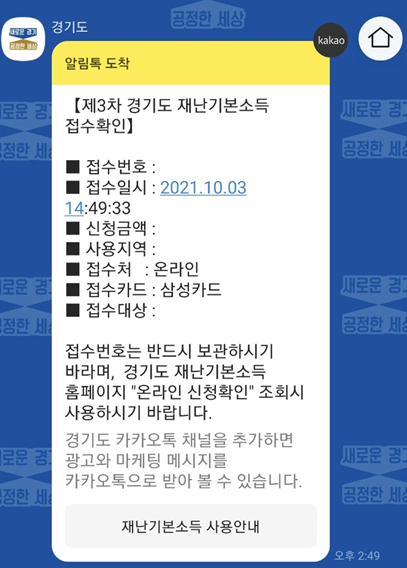 마치고 나면 알림톡으로 접수번호, 일시, 신청금액, 사용지역, 접수처, 접수카드, 접수대상이 나오니 틀린 것 없는지 확인하시면 됩니다. 그리고 앱에서 신청이 잘 되었는지 다시 확인하시면 되는데요.
