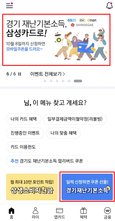 경기재난기본소득을 자기들의 카드사나 은행에서 사용하길 바라는 이벤트 광고들이 위 아래로 넘쳐나네요. 경기 재난기본소득, 삼성카드로 문구를 클릭하거나 하단의 파란색을 눌러주세요. 10월 8일까지 신청하면 모바일 쿠폰을 줍니다.