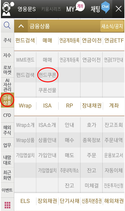 금융상품 - 매매 - 펀드쿠폰을 눌러주세요.