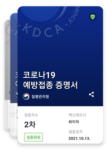 2차에 대한 증명서가 발급되었고 백신은 COVID19이며 제조사는 화이자, 로트번호와 접종은 2차수, 접종일자는 오늘 10월 13일, 접종국가는 대한민국으로 확인을 눌러주세요.