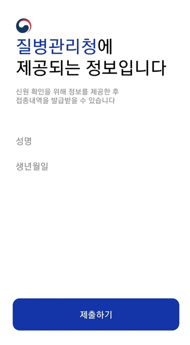 이름과 생년월일이 질병관리청에 제공되며 제출하기를 누르면 됩니다.