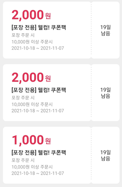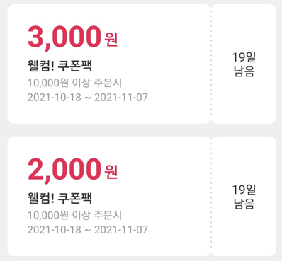 역시나 우려했던 상황이.. 1만원을 한번 더 해주나 했더니 쪼개서 3천원 1번, 2천원 3번, 1천원 1번 총 합계로 만원을 할인해주는 것이였네요. 그리고 1만원 이상 주문시 가능하고 11월 7일까지 사용해야하니 빨리 써먹어야하겠네요. 배달비 정도 빼주는 금액같고 뭐 이정도가 어딘가요?하고 배달시킬 때 사용하려고 합니다.