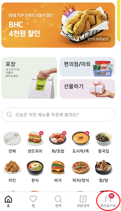 메인화면인데 우측 하단에 "마이요기요"를 클릭해주세요.
