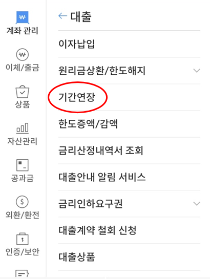 계좌관리 - 대출을 선택해서 세부 메뉴로 들어갑니다.