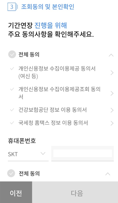 조회동의 및 본인확인을 전체동의하고 휴대폰 번호를 입력해서 인증하시기 바랍니다.
