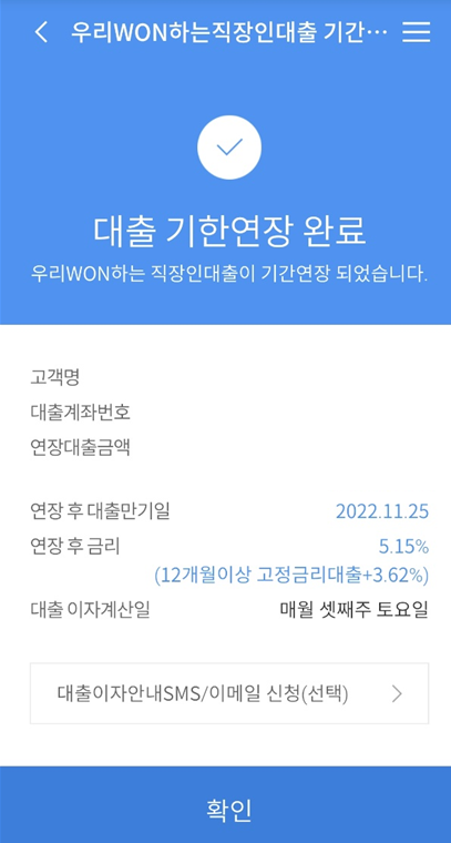 대출기한연장이 완료되었고 대출 이자계산일은 매월 셋째주 토요일입니다. 그리고 대출이자안내 SMS나 이메일을 신청하면 받아보실 수 있고 확인버튼을 누르면 대출화면이 종료되고 메인화면으로 돌아가니 우리은행에서 마이너스통장연장하시려는 분들은 상기내용 참고하시기 바랍니다.