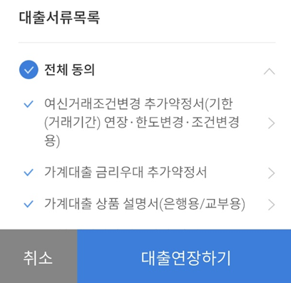 전체 동의 후 대출연장하기를 클릭해주세요. 대출 연장실행 후 취소 및 변경이 안되니 유의하시고 연장이 완료되는 시점부터 새로 산출된 대출 금리가 적용됩니다.