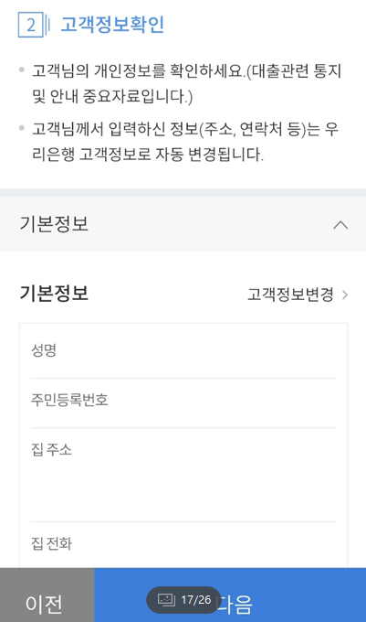 고객정보인 성명, 주민등록번호, 집주소, 집전화, 직장전화번호, 직장명, 부서명, 직장주소를 확인하고 다음을 클릭해주세요.