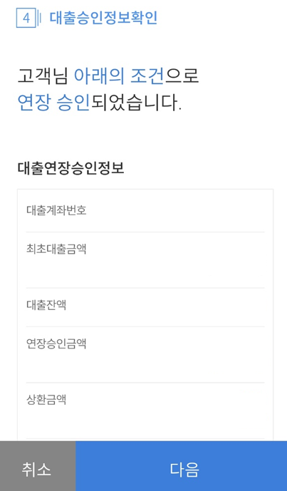 연장승인이 되었고 대출잔액, 연장승인금액, 상환금액을 확인하고 다음을 눌러주세요.