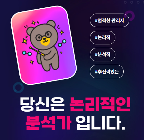 저는 ESTJ 유형의 논리적인 분석가로 나왔습니다. 목표만 정해지면 신속한 결정을 내리고 객관성과 공정성을 최우선으로 하고 행동에 있어 도덕적인 원칙에 충실하는 타입입니다.
