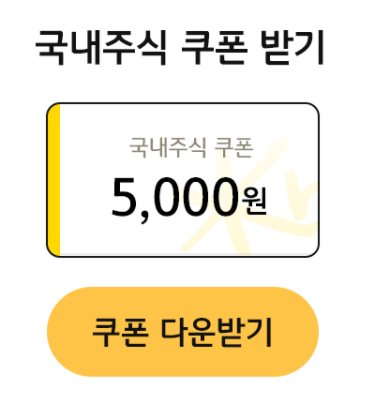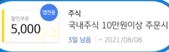 전원증정해주는 국내주식 쿠폰 5천원권의 사용기간은 21년 12월 10일입니다. 이 쿠폰은 국내주식 매수 시 쿠폰 금액만큼 돌려주는 형태입니다. 쿠폰 사용하는 방법을 알려드리겠습니다.