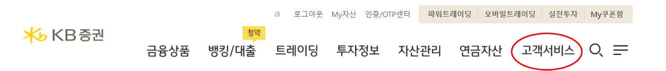 KB증권 홈페이지에 로그인 후 고객서비스를 클릭합니다.