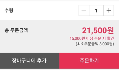 총 주문금액 21,500원인데 1만5천원 이상 주문시 할인이므로 주문하기를 눌러봅니다.
