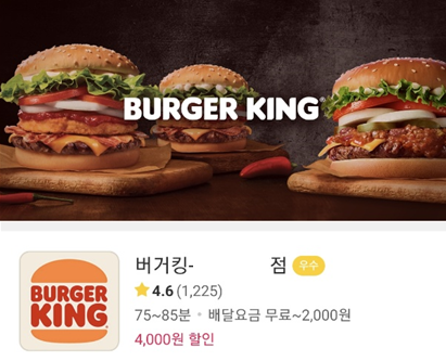 버튼을 누르면 등록된 주소 근처의 버거킹이 검색되며 저희동네는 평점 4.6점에 우수로 등록되어 있습니다. 75 ~ 85분?? 경악.. 아래 빨간색으로 4000원할인이 맘에 드네요.