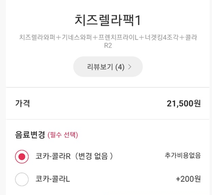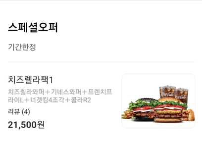 스페셜 오퍼 및 기간한정 품목인 치즈렐라팩1을 시켜보겠습니다. 치즈렐라와퍼와 기네스와퍼, 프렌치프라이L, 너겟킹4조각, 콜라R2가 포함되어 있습니다.
