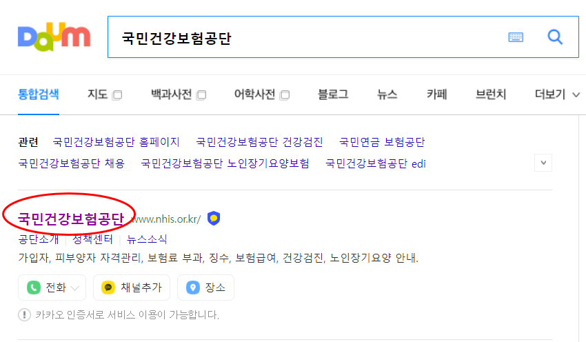 다음(daum)에서 국민건강보험공단을 검색하면 최상단에 나오는 링크를 클릭합니다.